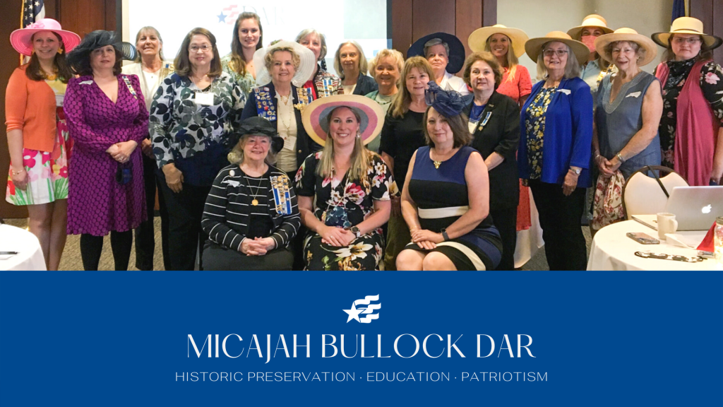Welcome to the Micajah Bullock Chapter of the National Society Daughters of the American Revolution (NSDAR or DAR), located in the capital city of Raleigh, North Carolina. Our chapter meets monthly from September to May, on a Saturday morning for brunch, a short business meeting, and a program.