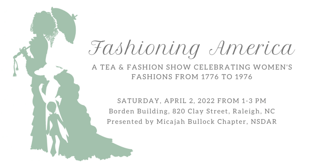 Celebrate Micajah Bullock Chapter’s 50th Anniversary at “Fashioning America: A Tea & Fashion Show Celebrating Women’s Fashions from 1776 to 1976” April 2, 2022 from 1-3 pm at the Borden Building in Raleigh. Purchase tickets here.